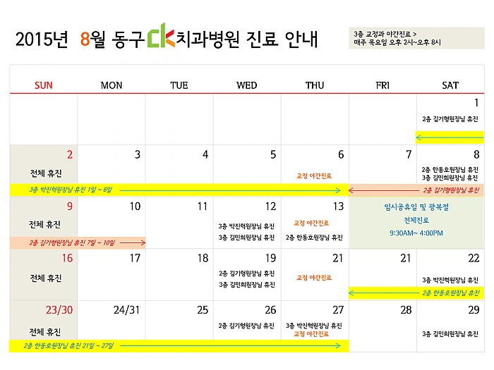 2015년 8월 동구 ck치과병원의 진료 일정 안내드립니다. ^0^(여기를 클릭하시면 크게 보실 수 있습니다.)