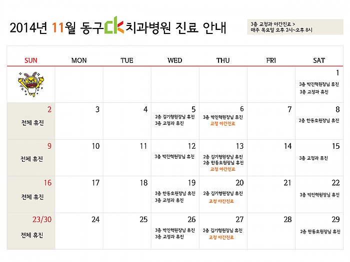 2014년 11월 동구 ck치과병원의 진료 일정 안내드립니다. ^0^(여기를 클릭하시면 크게 보실 수 있습니다.)
