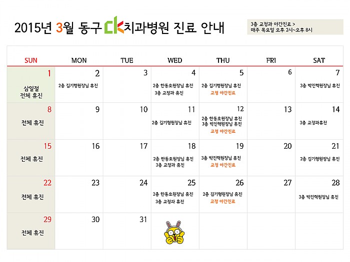 2015년 3월 동구 ck치과병원의 진료 일정 안내드립니다. ^0^(여기를 클릭하시면 크게 보실 수 있습니다.)
