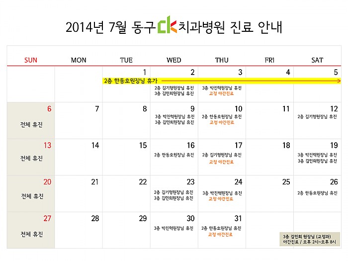 (점심시간 없이 진료) - 일요일, 공휴일: 전체휴진