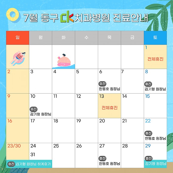 2023년 7월, CK치과병원 동구점의 진료일정을 안내드립니다.여기를 클릭!하시면 크게 보실 수 있습니다.