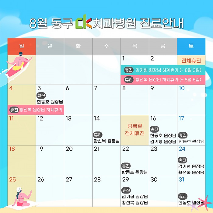 전체휴진일 : 8월 3일(토요일), 15일(광복절, 목요일)한동호 원장님 휴진일 : 8월 5일, 16일, 17일, 22일, 31일