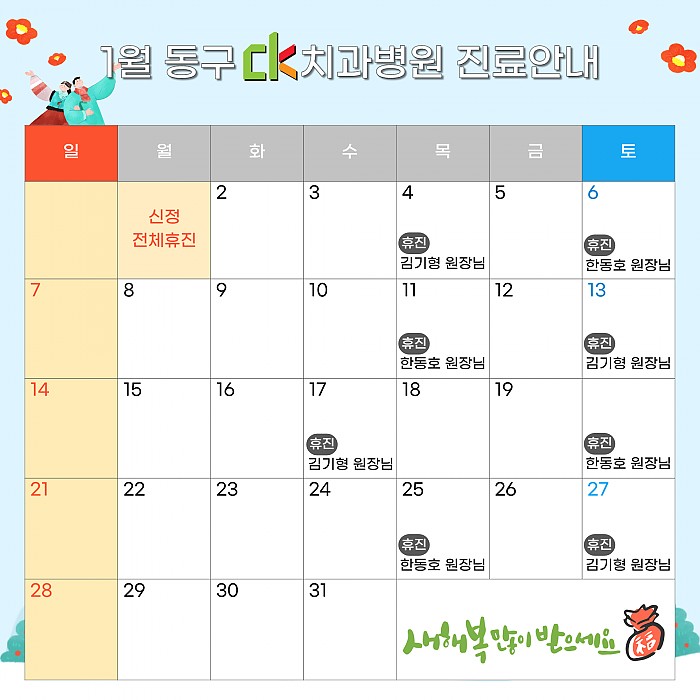 2024년 1월, CK치과병원 동구점의 진료일정을 안내드립니다.여기를 클릭!하시면 크게 보실 수 있습니다.