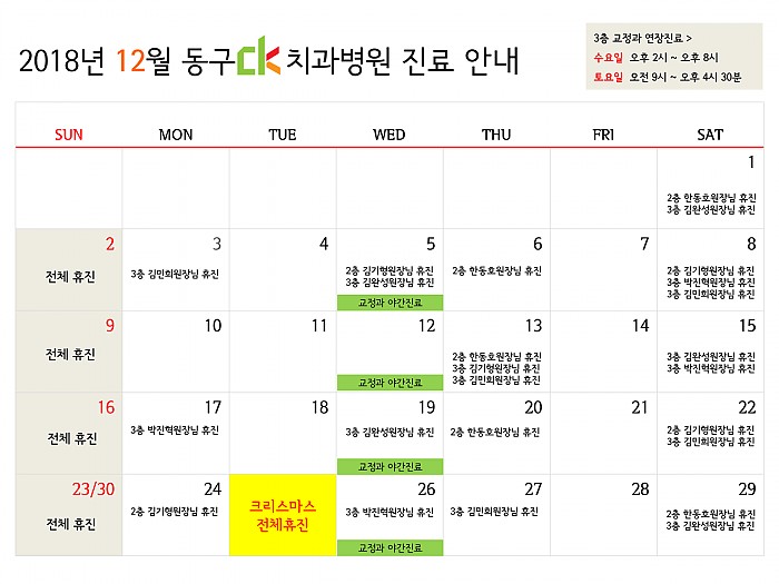 2018년 12월, 동구CK치과병원의 진료일정을 알려드립니다!* 12월 25일 크리스마스는 전체 휴진입니다.