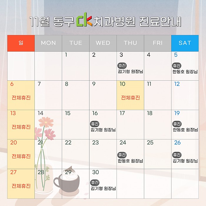 2022년 11월, 동구 CK치과병원의 진료일정을 알려드립니다.여기를 클릭!하시면 크게 보실 수 있습니다.