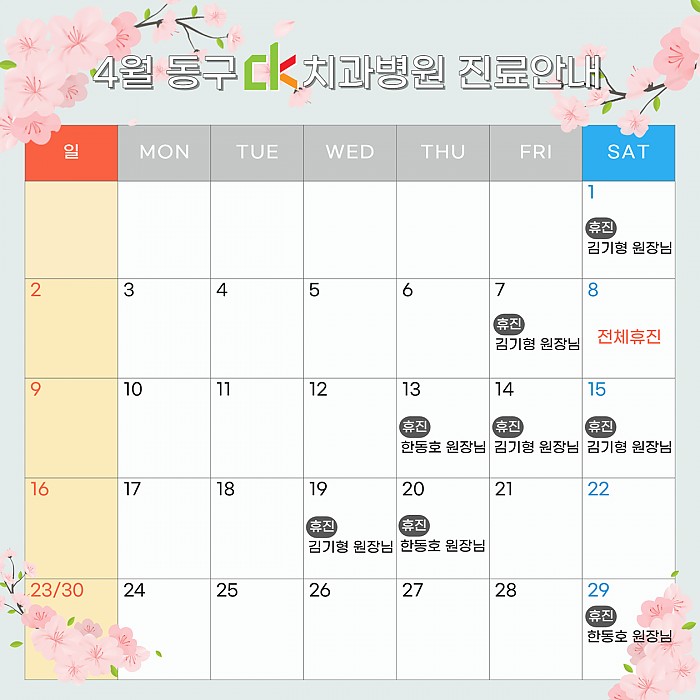 2023년 4월, CK치과병원 동구점의 진료일정을 안내드립니다.여기를 클릭!하시면 크게 보실 수 있습니다.