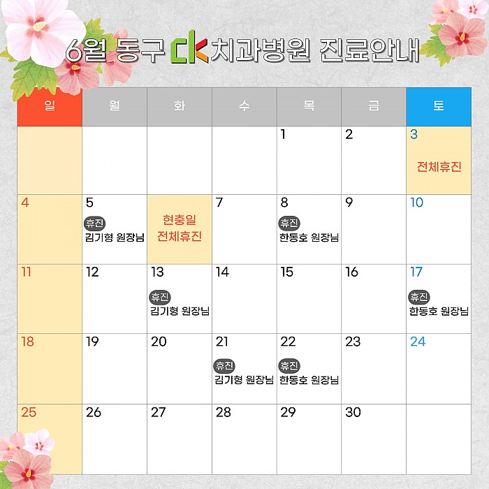 2023년 6월, CK치과병원 동구점의 진료일정을 안내드립니다.여기를 클릭!하시면 크게 보실 수 있습니다.