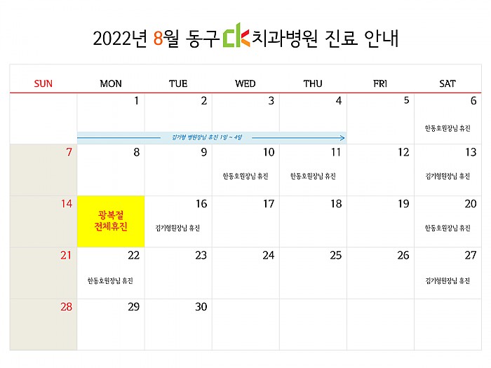 2022년 8월, 동구 CK치과병원의 진료일정을 알려드립니다.여기를 클릭!하시면 크게 보실 수 있습니다.