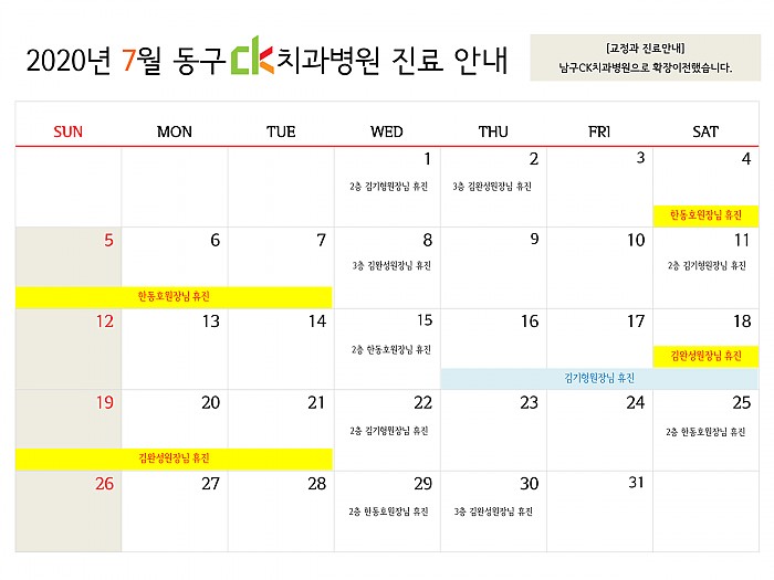 2020년 7월, 동구CK치과병원의 진료일정을 알려드립니다!4일 ~ 7일 : 한동호원장님 휴진