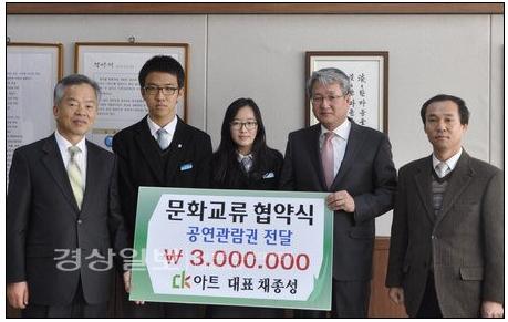 CK아트홀 현대고,대송고 문화교류 협정 2011-01-11 14:32:00 조회3805회 CK아트홀(대표 채종성)은 현대교등학교와 6일 문화교류를 위한 협약을 맺었다. CK아트홀은 이들 학교에 300만원 상당의 공연관람권을 지원해 학생들이 공연을 즐길 수 있게 됐다. 목록