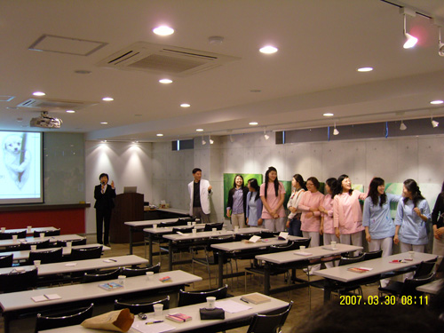 인사교육 전에 서로 인사를 나누며 즐겁게 게임을 하는 모습