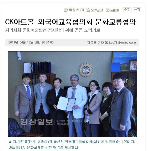 CK아트홀(대표 채종성)은 울산시 외국어교육협의회(협회장 김원용)와 12일 오후 CK아트홀에서 문화교류를 위한 협약을 체결했다. 울산시 외국어교육협의회는 울산지역 외국어학원 원장들과 강사들의 모임으로 회원수는 2000여명이다. 이번 협약 체결을 계기로 CK아트홀과 울산시 외국어교육협의회는 지역사회 문화예술 발전과 협의회 회원들의 정서함양을 위해 공동으로 노력하기로 했다. CK아트홀은 협의회 회원들에게 공연관람료의 30%를 할인해 주기로 했으며 20명 이상 단체관람 때는 공연 관람료의 40% 할인혜택을 제공하기로 했다. CK아트홀 채종성 대표는 “지역 고등학교와 문화교류 협약을 체결해 학생들의 정서함양과 문화체험을 위해 각종 할인과 문화서비스도 제공하고 있다”며 “앞으로도 수준 높은 공연을 더 마련해 지역사회의 문화발전을 위한 사업을 지속적으로 추진할 계획이다”고 말했다. 한편 채종성 대표는 CK치과병원 대표원장으로 지난해 11월 한국메세나협의회의 창의상을 수상한 바 있다. 지난 2009년 병원 건물 내에 188석 규모의 CK아트홀과 갤러리를 개관, 매월 공연과 전시 행사를 열고 있으며, 이색 명품콘서트 등 기획공연을 통해 지역사회에 공연예술 문화나눔을 실천하고 있다. 김봉출기자 kbc78@ksilbo.co.kr