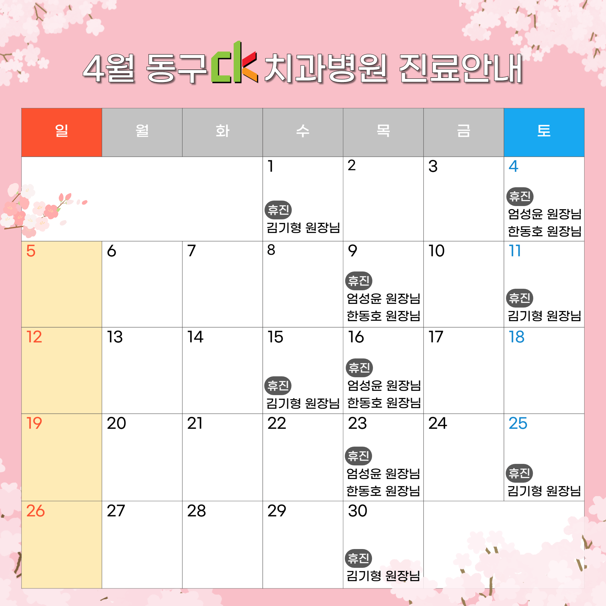 2026년 4월 진료일정 안내 2026-03-30 09:48:29 조회16회 처음부터 제대로, 바른 진료 20년 동구 CK치과병원의 2026년 4월 진료일정을 안내드립니다. 한동호, 엄성윤 원장님 : 4월 4일, 9일, 16일, 23일 김기형 원장님 : 4월 1일, 11일, 15일, 25일, 30일 목록