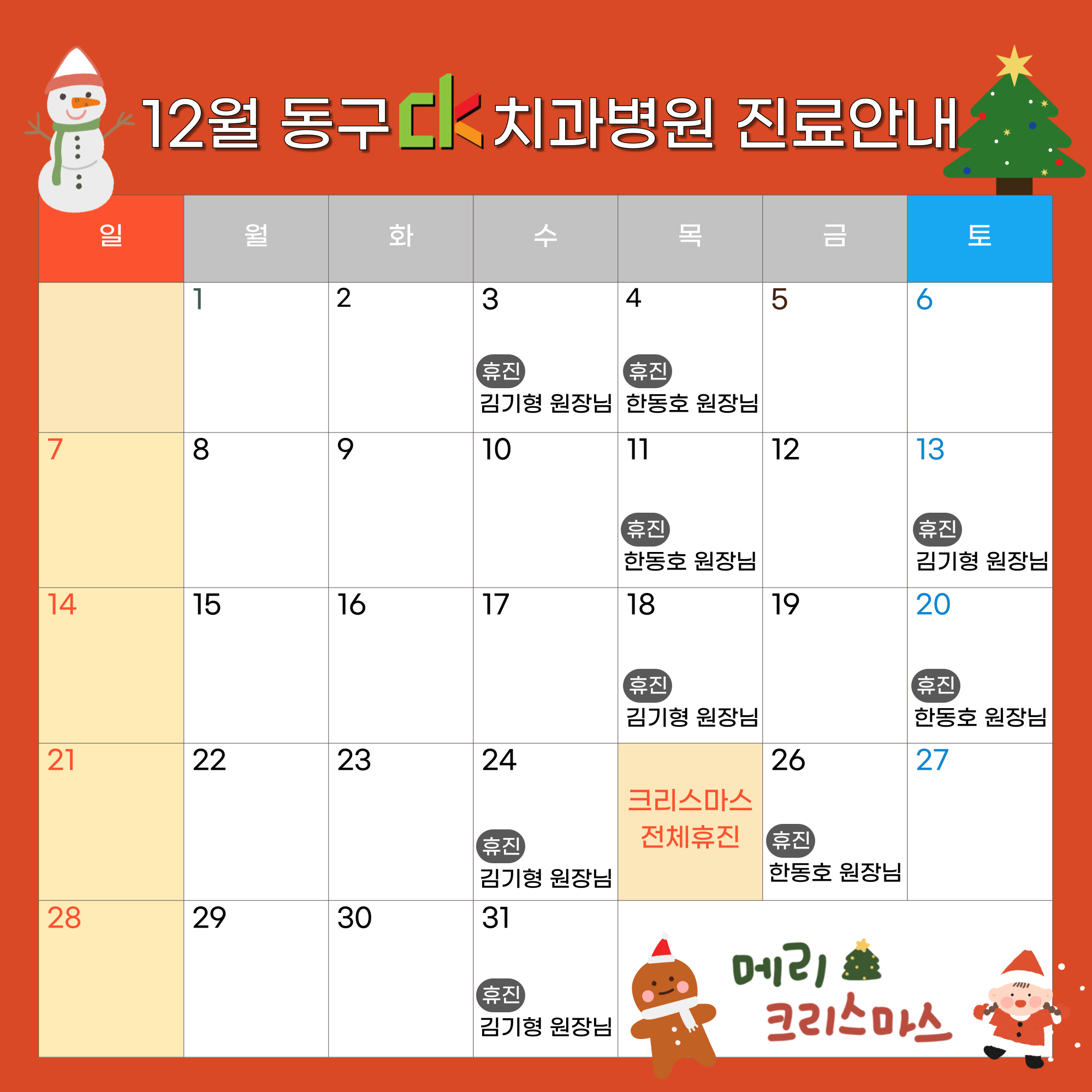 2025년 12월 진료일정 안내 2025-11-29 11:33:53 조회580회 2025년 12월 동구 CK치과병원의 진료일정을 안내드립니다. 전체휴진일 : 12월 25일 (크리스마스, 목요일) 한동호원장님 : 12월 4일, 11일, 20일, 26일 김기형원장님 : 12월 3일, 13일, 18일, 24일, 31일 목록