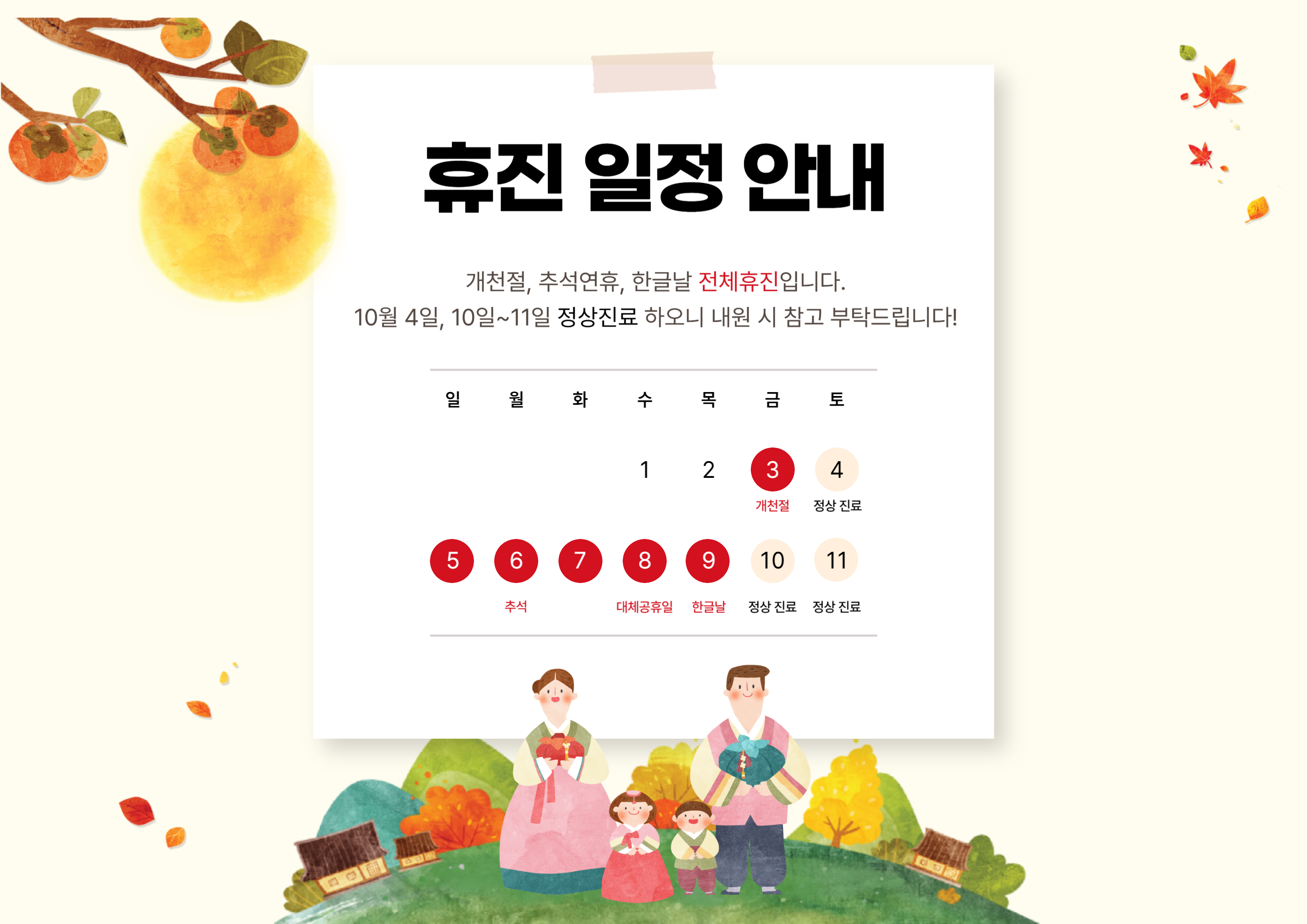 10월 4일 토요일, 10일 ~ 11일 정상 진료 하오니 내원 및 진료 예약에 참고 부탁드립니다.