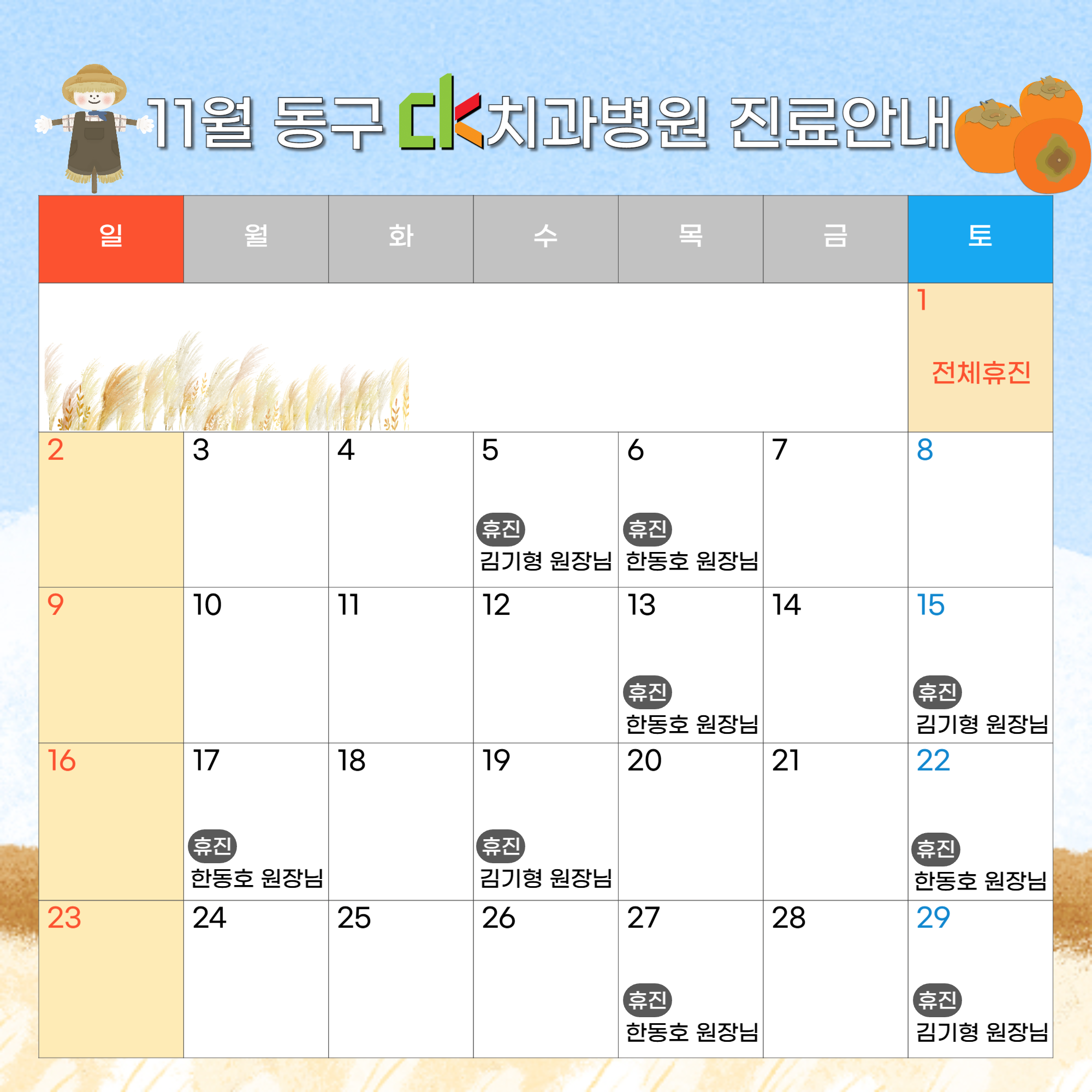 2025년 11월 진료일정 안내 2025-10-31 13:07:33 조회869회 2025년 11월 동구 CK치과병원의 진료일정을 안내드립니다. 전체휴진일 : 11월 1일 (토) 한동호 원장님 휴진일 : 11월 6일, 13일, 17일, 22일, 27일 김기형 원장님 휴진일 : 11월 5일, 15일, 19일, 29일 목록